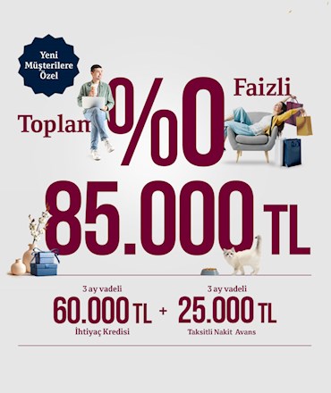3 ay vadeli 25.000 TL Taksitli Nakit Avans ve 3 ay vadeli 60.000 TL ihtiyaç kredisinden oluşan %0 faizli 85.000 TL’ye varan faizsiz kredi kampanyasından yararlanmak için koşulları ve yapmanız gerekenleri sizin için aşağıda listeledik.